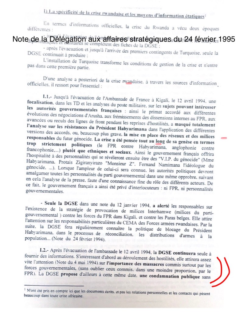 « la France (Hubert Védrine) a seulement cherché à imposer un compromis politique au gouvernement hutu avec les accords de paix d’Arusha ». Il semble oublier qu’un conseiller de l’Elysée affirmait alors que « Arusha, c’est Munich » et que l’ambassadeur de France, en mars 93, soutenait la CDR (coalition pour la Défense de la République, les pires extrémistes) qui représentait à ses yeux le « nationalisme hutu », ce même ambassadeur jugeant dans un télégramme diplomatique que le Président Habyarimana, « un chef d’État qui a finalement tout raté », était à remplacer…