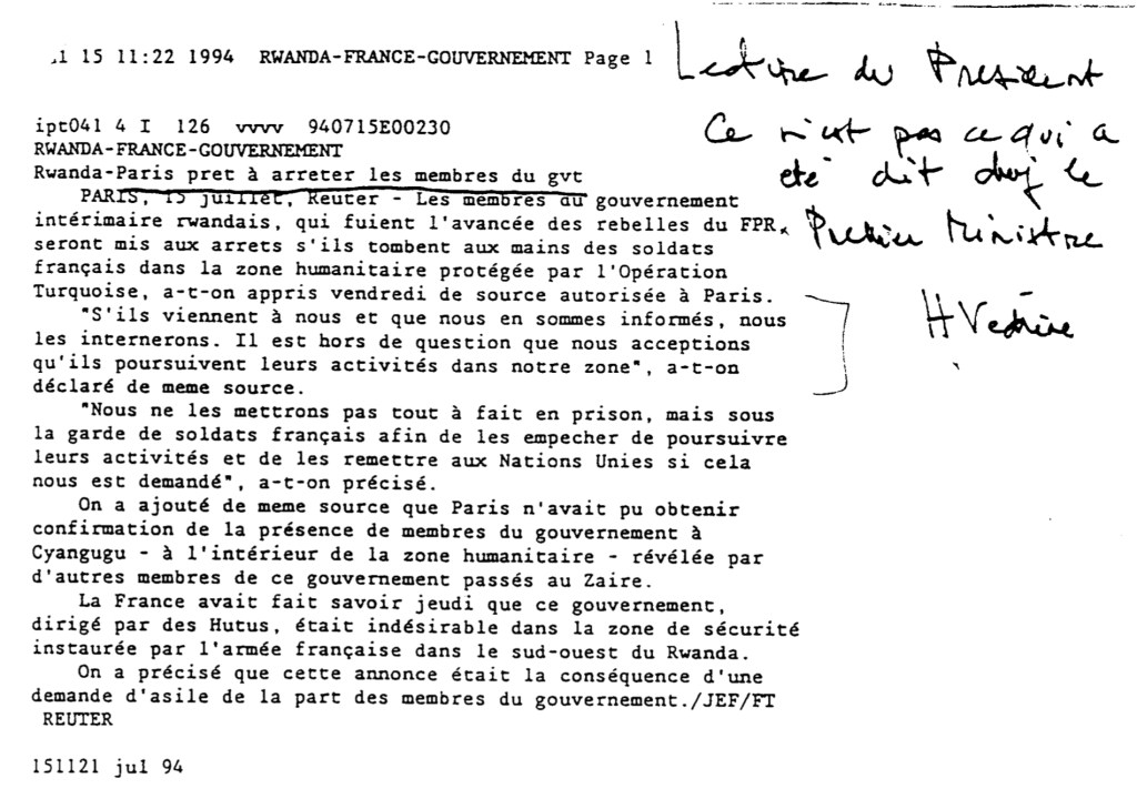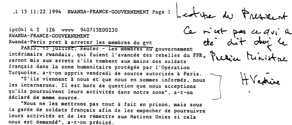Dans les archives de l’Élysée figure notamment la copie d’une dépêche émise depuis Paris, le 15 juillet en fin de matinée, par l’agence de presse Reuters sous un titre éloquent : « Paris prêt à arrêter les membres du gouvernement ». « Les membres du gouvernement intérimaire rwandais […] seront mis aux arrêts s’ils tombent aux mains de soldats de français dans la zone humanitaire protégée par l’opération Turquoise », indiquait l’agence de presse internationale, qui disait tenir ses informations d’une « source autorisée à Paris ».