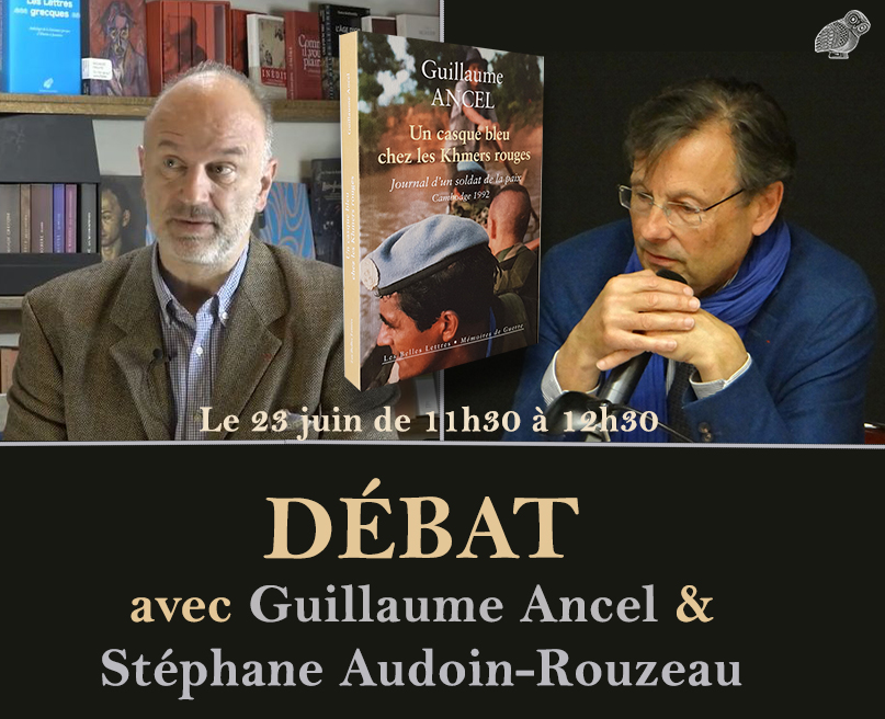 Débat entre un auteur engagé, Guillaume Ancel et un historien encore plus engagé, Stéphane Audoin-Rouzeau, organisé par Les Belles Lettres le 23 juin 2021, sur Un casque bleu chez les khmers rouges, journal d’opération d’un soldat de la paix