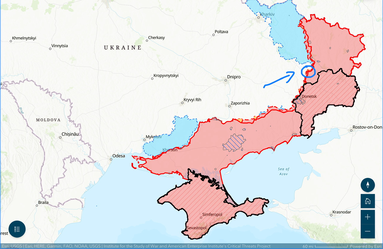 La fixation joue effectivement un rôle de temporisation avant les prochains renforts d’invasion. Ces renforts massifs quantitativement (qualité ???) autoriseront plusieurs axes pour percer des lignes ukrainiennes. Ils garantiront aussi temporairement au Kremlin une présence disputée sur tout le couloir le long de la mer d’Azov, entre le Donbass et la Crimée. En cas de scénario finlandais si l’ONU organise des négociations (ou Turquie ?), le verre d’eau à moitié vide russe correspondrait à la sécularisation du couloir Est-Sud, donc l’appropriation définitive de la mer d’Azov.