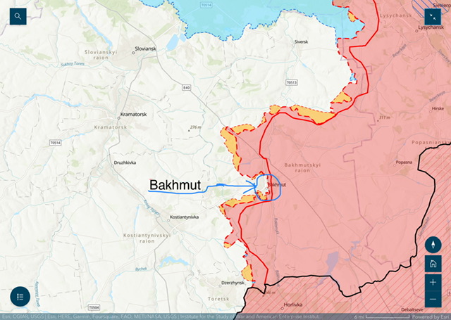 Bakhmut tant de fois annoncé comme quasiment conquise par les Russes, mais toujours en vie , même si la pince essaye toujours en vain de se refermer sur la ville (défenses appuyées sur des lignes anciennes qui restent efficaces)