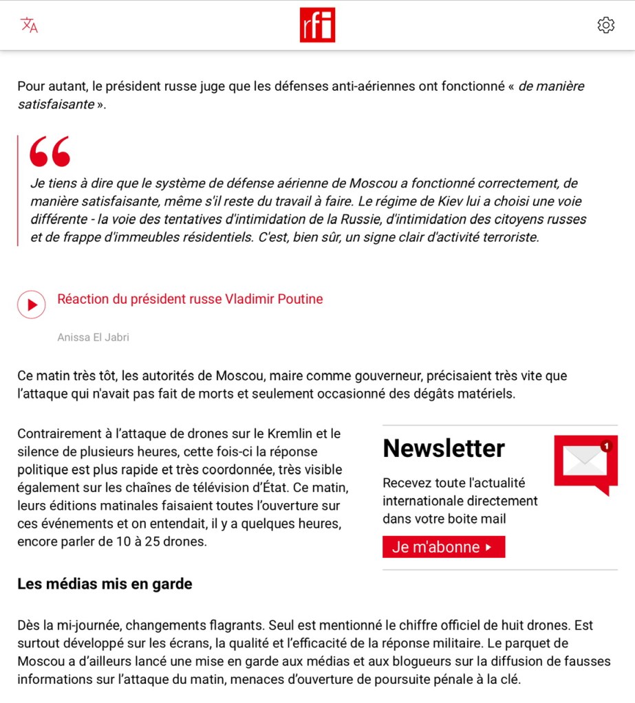Cette vague de drones contre la capitale russe relève de « l’effet boomerang » pour le régime de Poutine, qui croyait imposer son ordre par sa puissance destructrice et qui doit maintenant se défendre des incursions venues d’Ukraine.
