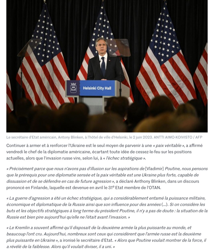 L’enjeu de cette offensive ukrainienne « à venir » est crucial car, en cas d’échec, l’enlisement des forces ukrainiennes ferait craindre un scénario à la coréenne avec une partition durable de l’Ukraine et la prolongation de la situation insoutenable d’un tel conflit, scénario qui fait son chemin parmi les Républicains aux Etats-Unis s’ils revenaient au pouvoir avec les élections présidentielles de 2024.