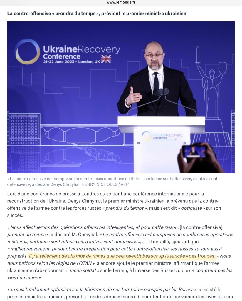 La question du minage de la ligne de front est largement connue, d’autant qu’il est difficile de se cacher lors de la pose de mines, en particulier des antichars qui pèsent plusieurs kg et nécessitent d’être un peu enfouies pour ne pas être facilement repérables et détruites. Ce n’est donc pas une découverte pour les forces ukrainiennes qui ont longuement préparé cette offensive, mais un obstacle pénible à traverser quoiqu’il arrive, plus encore sous les feux concentrés des Russes.