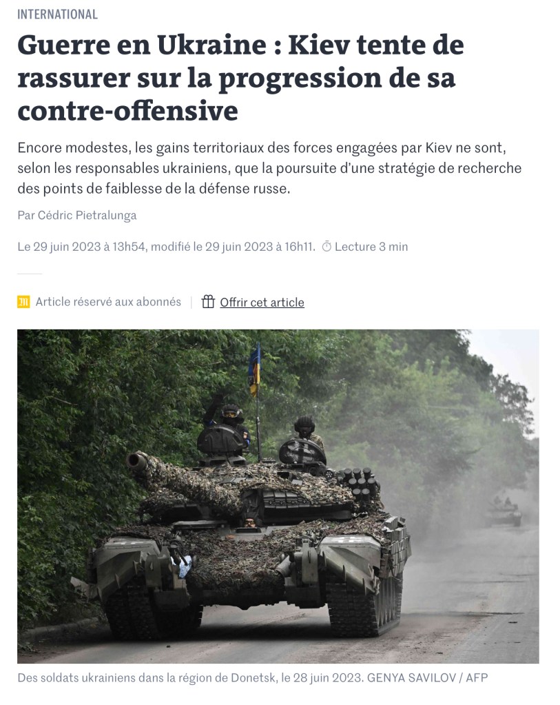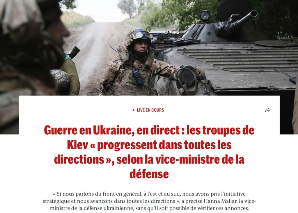 L’offensive lancée le 6 juin par les forces ukrainiennes pour libérer leur pays rentre dans sa quatrième semaine de combats. Nous disposons toujours d’aussi peu d’informations pertinentes du côté ukrainien : lorsque la vice-ministre de la défense déclare que « les troupes de Kiev progressent dans toutes les directions », elle ne donne aucune indication étayée sur le déroulement réelle des opérations et elle se contente d’occuper le terrain médiatique pour ne rien en révéler.