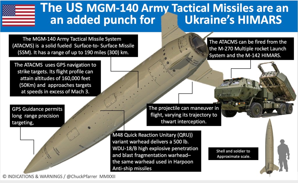 Ils permettraient aux Ukrainiens de compenser en partie l’absence d’avions de chasse pour faire ces frappes dans la profondeur. Les ATACMS sont en effet tirés par les lance-roquettes multiples (on remplace un panier de 6 roquettes par un missile ATACMS) que savent parfaitement utiliser les Ukrainiens, mais dont les munitions actuelles portent « seulement » à 80 km.