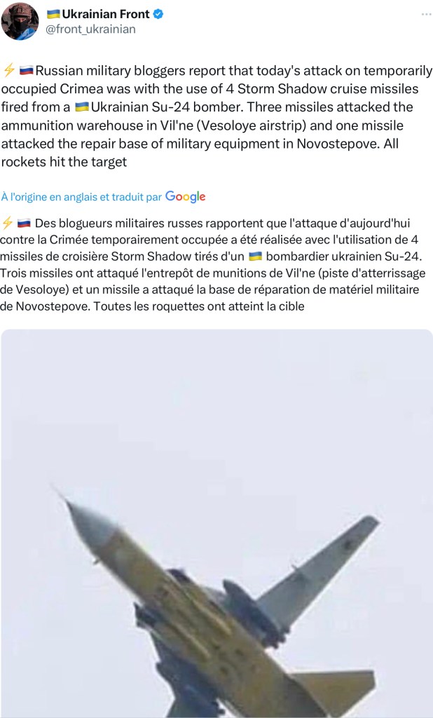 Ces derniers jours, les Ukrainiens ont frappé et détruit des dépôts de munitions et de carburant en Crimée, notamment avec des missiles Storm Shadow / Scalp livrés par les Britanniques et les Français.