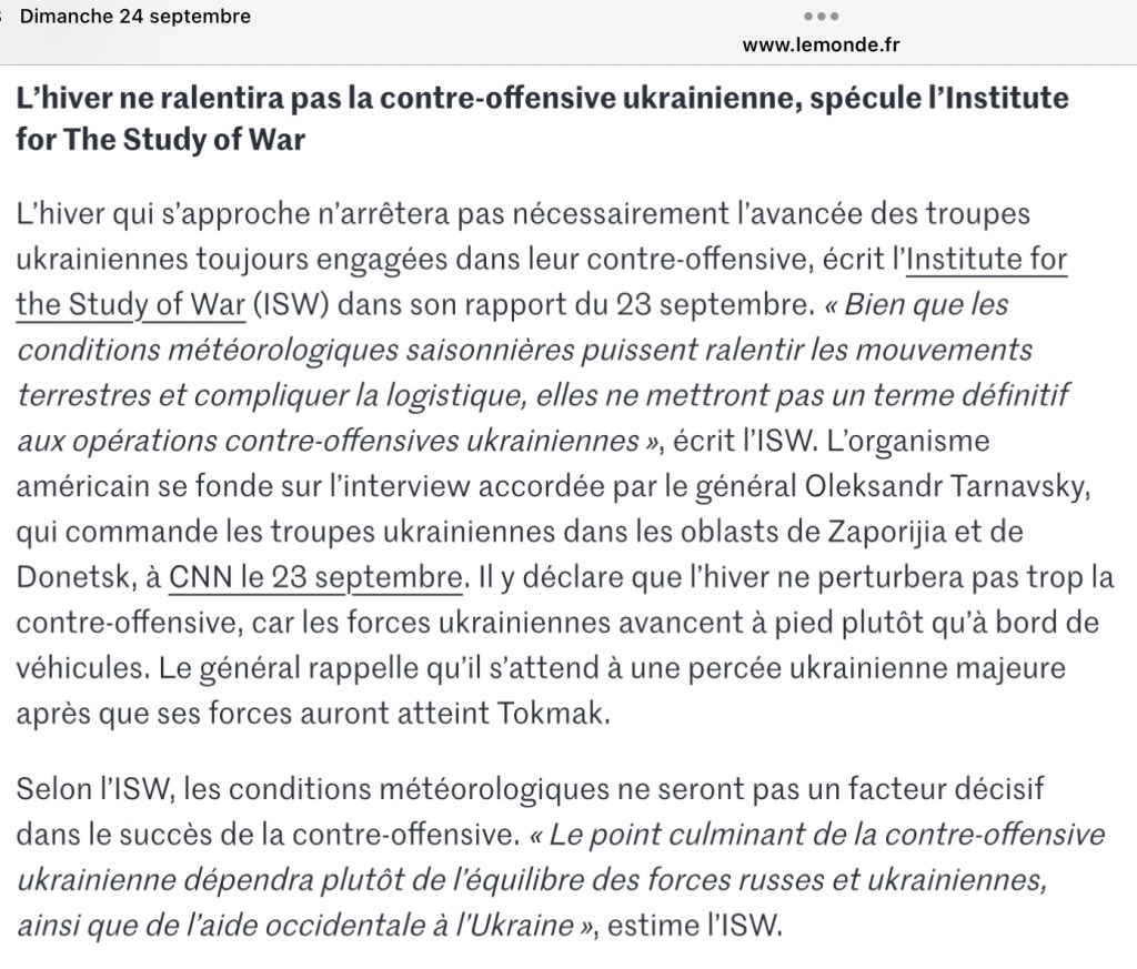 La bataille du triangle constitué par les trois localités de Robotyne-Novoprokopivka-Verbove bat son plein, elle est cruciale pour la suite de l’offensive ukrainienne dont nous savons désormais qu’elle durera plusieurs mois. De plus, il s’avère que le sol dans le sud de cette région n’est pas exposé au phénomène de raspoutitsa : même s’il a commencé à devenir boueux avec les pluies d’automne, il ne se transformera pas en marécage ce qui est éminemment favorable aux Ukrainiens, et que confirme implicitement le général Tarnavsky qui commande dans cette région.
