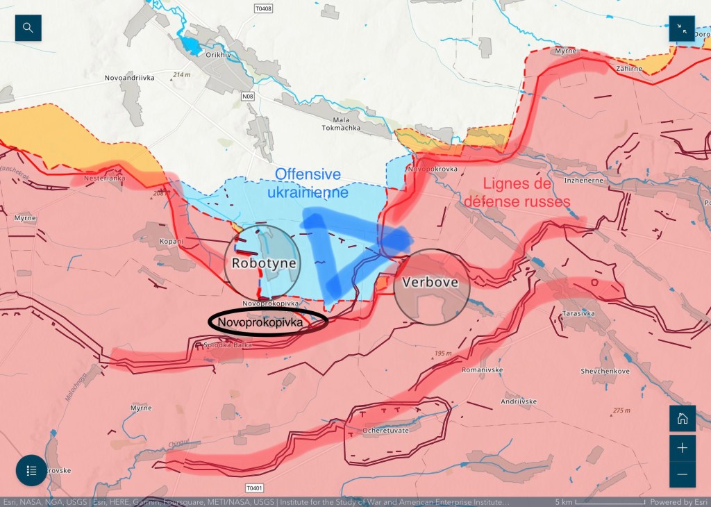 Nous sommes dans la partie sud du front, dans la région de Zaporijia. Après avoir traversé la première ligne de défense russe, les forces ukrainiennes se sont emparées de la petite localité de Robotyne. Novoprokopivka est 2 km plus au sud et Verbove à 10 km au sud-est de Robotyne, leur conquête marquera la percée de la deuxième ligne de défense russe, qui en compte trois.