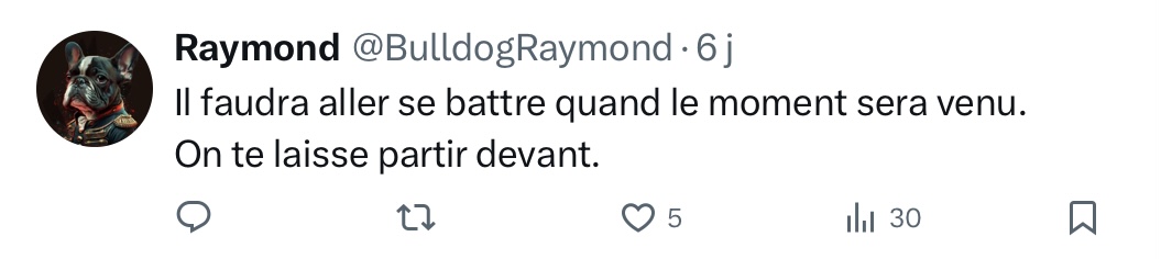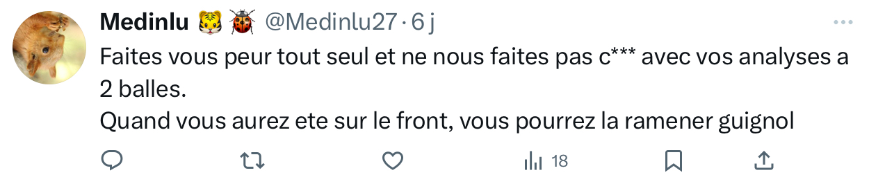Ce que vous venez d’écrire, et sans aucune prétention de ma part, je le répète depuis de nombreux mois sur « X » : « l’insouciance de nos dirigeants, leur irresponsabilité, leur manque d’engagement et leur couardise surexcitent poutler. Ces faiblesses nous rapprochent inexorablement de la 3 ème G.M. «