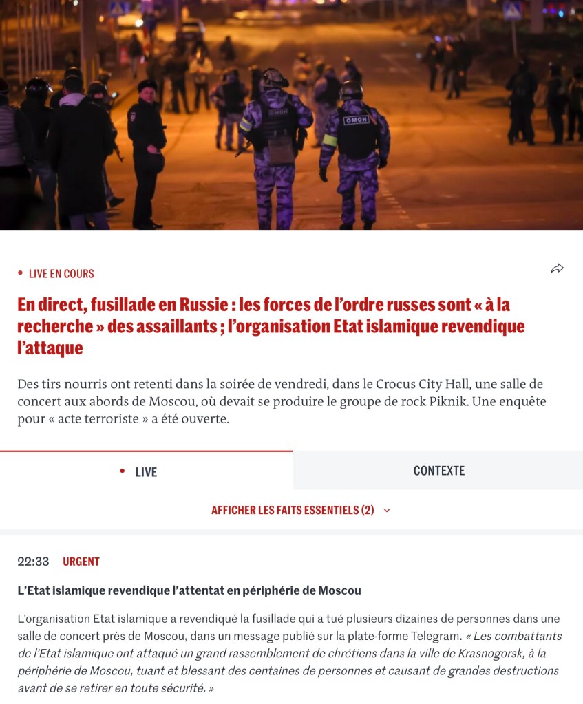 Cet attentat a été revendiqué par l’Etat islamique et correspond bien à leur manière de faire – un mode opératoire assez similaire à l’attentat du bataclan –, avec un petit groupe de tueurs bien armés qui massacrent des civils rassemblés pour un moment festif (un concert) et par nature inoffensifs. Un massacre de sang-froid pour choquer la société et s’en faire un ennemi mortel, sans rapport avec les attaques ukrainiennes sur le territoire russe qui ne recherchent jamais ce genre de résultat dont le premier effet serait de remettre en cause le soutien des 50 pays qui les aident à se défendre.