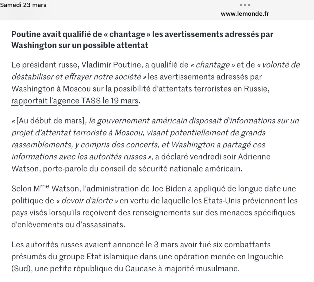 La Russie de Poutine avait d’ailleurs été informée du risque d’un tel attentat par… les Etats-Unis. Ceux-ci avaient intercepté assez d’informations pour affirmer début mars qu’une telle attaque terroriste était en préparation, « visant potentiellement de grands rassemblements, y compris des concerts » à Moscou, et qu’il fallait que les autorités russes s’en prémunissent. Convaincu de sa toute-puissance, Poutine a pourtant commis l’erreur grossière de dénoncer publiquement cette alerte, comme un « chantage » et une « volonté de déstabiliser et effrayer notre société », dans son esprit définitivement paranoïaque…