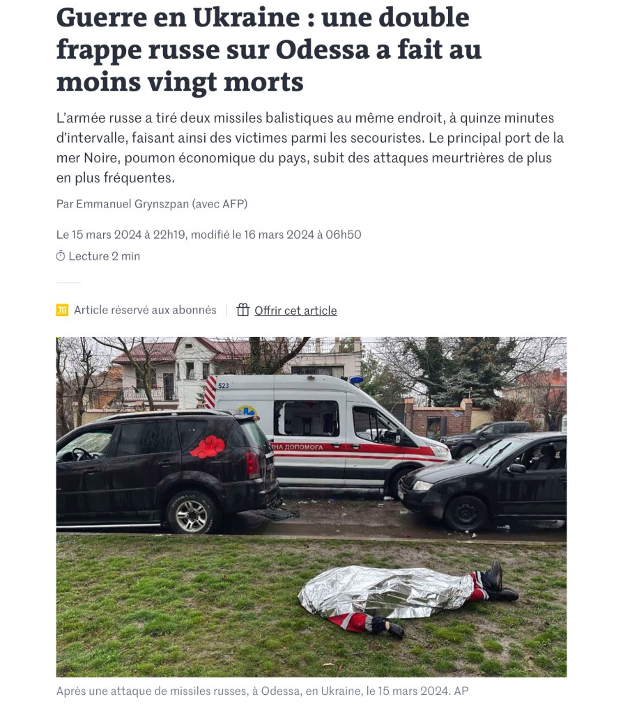 La semaine dernière, la Russie a mené entre autres une frappe particulièrement vicieuse contre Odessa avec un premier missile visant une cible civile, suivi 15 minutes plus tard d’un deuxième missile destiné à tuer le plus grand nombre de secouristes. Cela s’appelle un attentat terroriste. Souhaitons que Poutine, ce dirigeant qui règne par la terreur, périsse à son tour par la terreur.