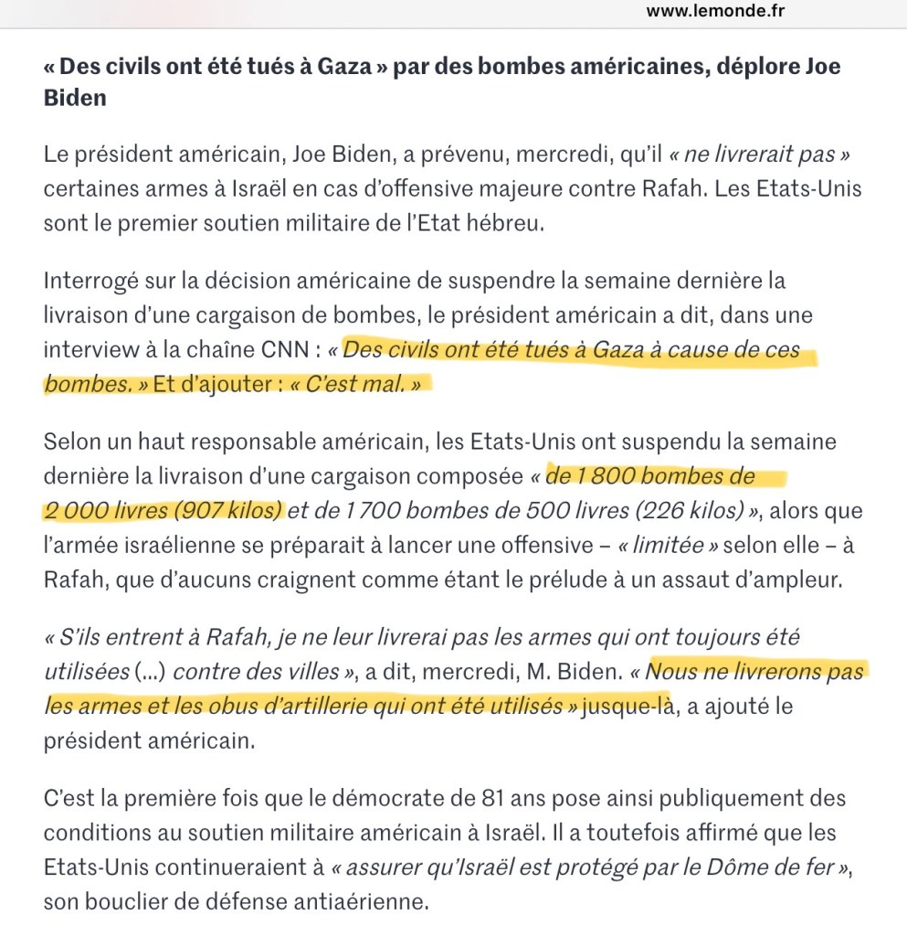 Alors Biden essaye de poursuivre la négociation en utilisant pour la première fois un argument de poids pour obliger Netanyahou à l’écouter : ce sont les Etats-Unis qui fournissent les munitions (et la plupart du matériel militaire) à l’armée israélienne, il le reconnaît publiquement en annonçant qu’il réfléchit à bloquer une livraison importante de bombes, notamment celles pour avions de 900 kg (appelées par commodité « une tonne ») pour environ 1,800 exemplaires.