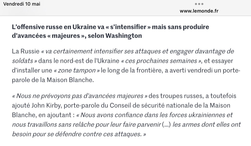 En Ukraine, la situation sur le front est effectivement en train de se retourner. Le président dictateur russe Vladimir Poutine était bien seul pour commémorer le « jour de la Victoire » ce 9 mai à Moscou. Il n’avait pas grand-chose à fêter dans sa guerre de soumission contre l’Ukraine qui dure maintenant depuis plus de 800 jours.