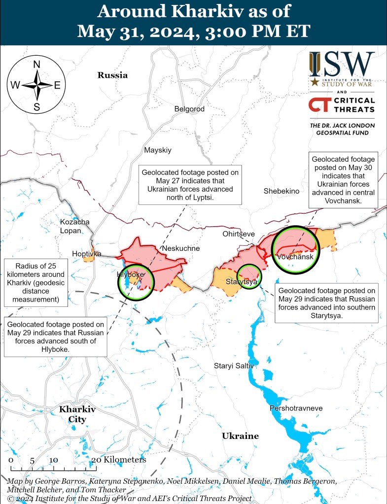 Carte ISW au 31 mai 2024, la ligne de front est indiquée en rouge