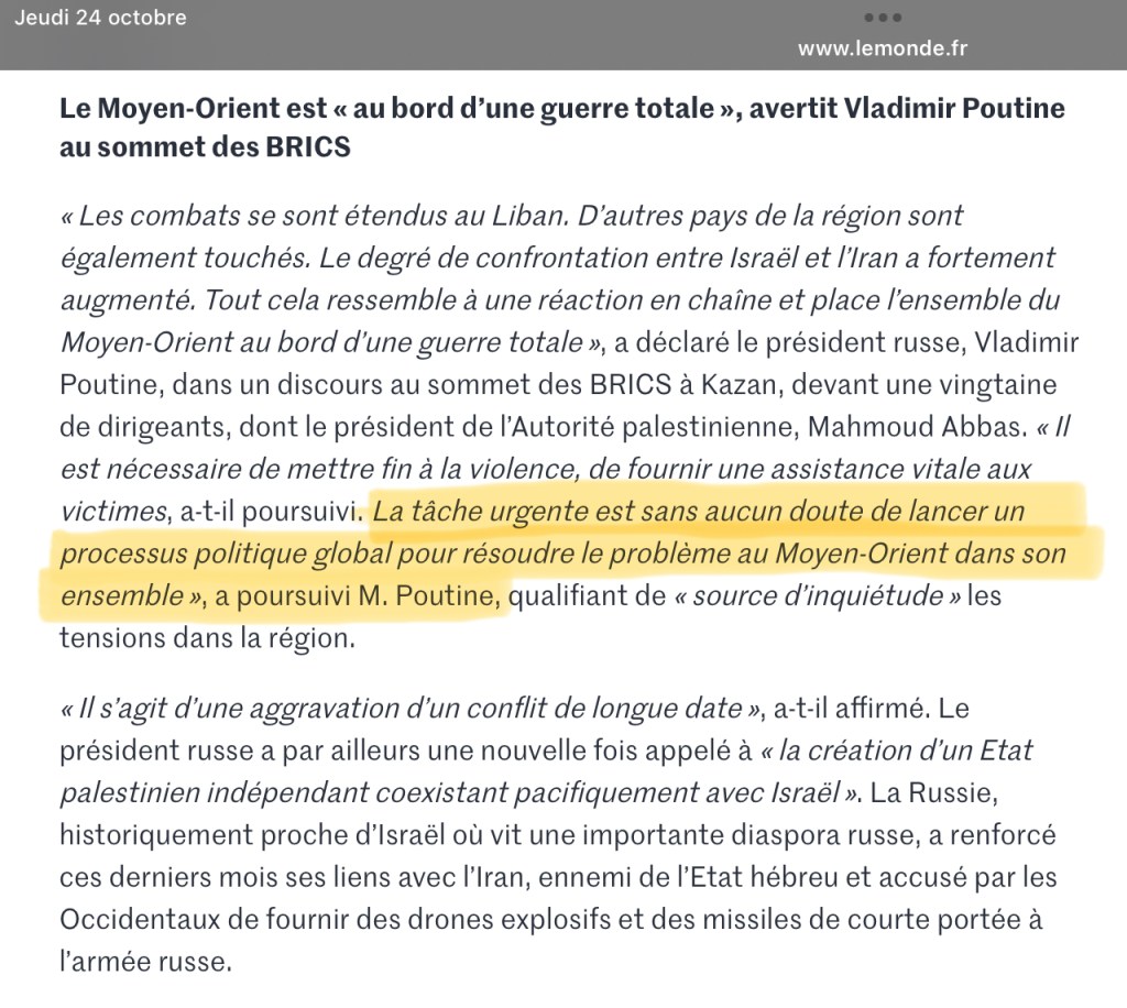 Grand bénéficiaire de cette guerre qui ensanglante le Proche-Orient et qui déchire les alliés de l’Ukraine, Poutine a néanmoins besoin de sortir de cette confrontation qu’il a lui-même déclenchée contre l’Ukraine mais que son armée n’est pas en mesure de gagner en l’état. Il est avéré désormais qu’il a fait appel à un important contingent de soldats de la Corée du Nord pour consolider ce front plus fragile qu’il n’y parait.