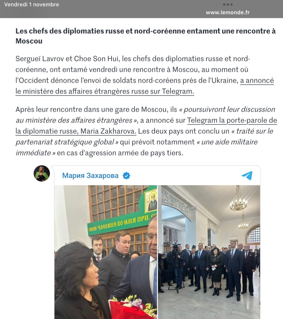 Ps : La MAE Nord-Coréenne a parlé de  » soutien au peuple et à l’armée Russe et à leur Guerre Sacrée  » Cela a été censuré en France Renseignez-vous sur la signification de cette expression .