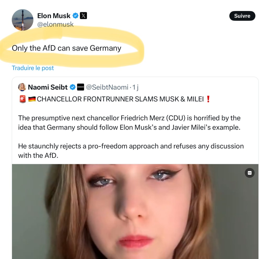 Alors que des élections législatives doivent se tenir en Allemagne fin février, le richissime homme d’affaires américain et propriétaire notamment du réseau X (ex Twitter) affiche son soutien à l’AfD en déclarant même que seul ce parti d’extrême-droite peut sauver l’Allemagne.