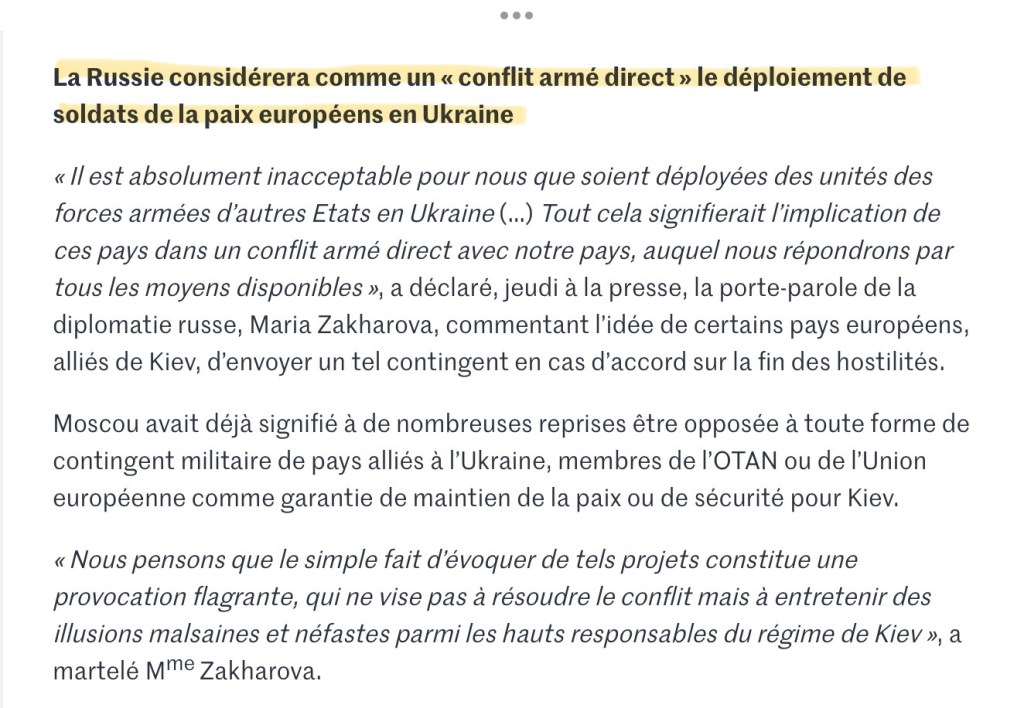 Moscou met son veto au déploiement d’une telle force européenne, invoquant évidemment qu’elle ne peut pas accepter la présence de nations qu’elle considère agressives, comme si elle pouvait imposer sa volonté à l’Ukraine et aux Européens, avec l’aide des Etats-Unis…