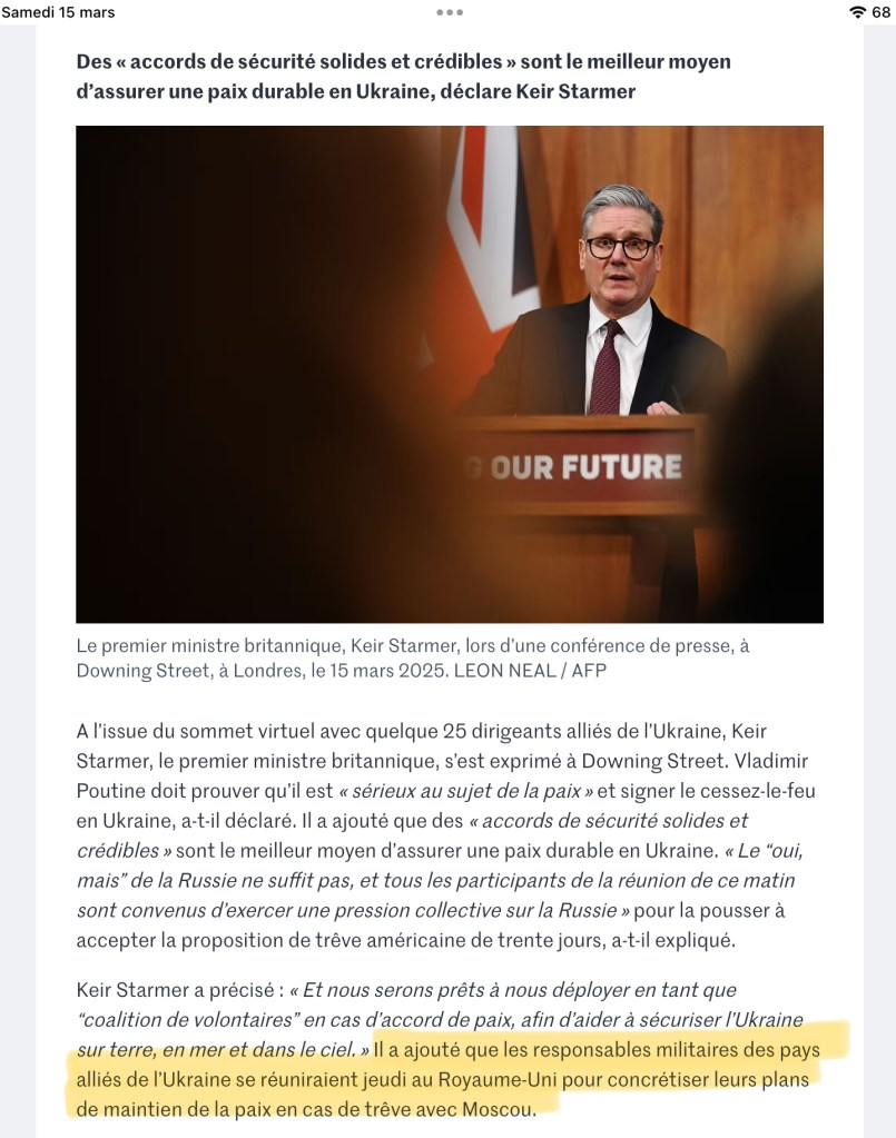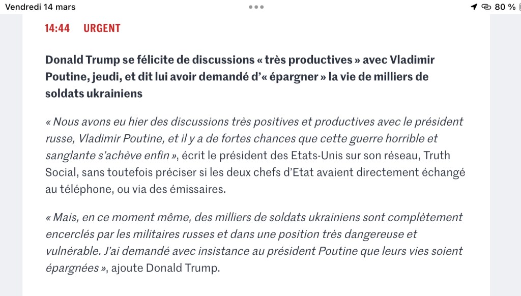 Bonjour Guillaume, encore merci pour votre excellent post. Comme je le commentais la semaine dernière, tout démontre que Poutine a dealé avec Trump pour récupérer Koursk:Une « complication » qui arrangé bien les affaires des 2 lascars!et c’est bien insupportable : dans ce cas, si la Russie récupère son territoire, pourquoi l’Ukraine ne récupérerait pas les siens?! Après tout, c’est la Russie qui a commencé et a été prise à son propre jeu, ce serait juste la moindre des choses.Je pense sincèrement qu’il est impensable d’imaginer laisser Poutine conserver les territoires qu’il a volé à l’Ukraine. Si on laisse faire ça, ça recommencera. Je suis tout à fait la ligne de Nicolas Tenzer sur ce sujet. Si négociation il doit y avoir, la Crimée pourrait constituer une exception, ce qui serait déjà une offre plus que généreuse à concéder à un autocrate.L’Europe se doit d’imposer une paix juste si elle veut rester crédible, si elle veut éviter qu’une telle situation se reproduise, si elle veut éviter un risque de nouveau conflit à moyen, voir même court terme.Il est aberrant que les USA ne demandent aucune concession à Poutine, tout est là : il est ABSOLUMENT INDISPENSABLE d’imposer des concessions à Poutine. On a souvent entendu l’expression pour l’Ukraine, mais Poutine non plus n’a pas les cartes pour imposer toutes ses volontés. La supériorité écrasante de puissance des USA et des alliés doit bien servir à quelque chose!!! Et plus particulièrement dans ce contexte.J’espère que les européens auront le courage et sauront exiger une négociation digne de la situation. L’avenir du Monde Libre et de la vraie paix en dépend.