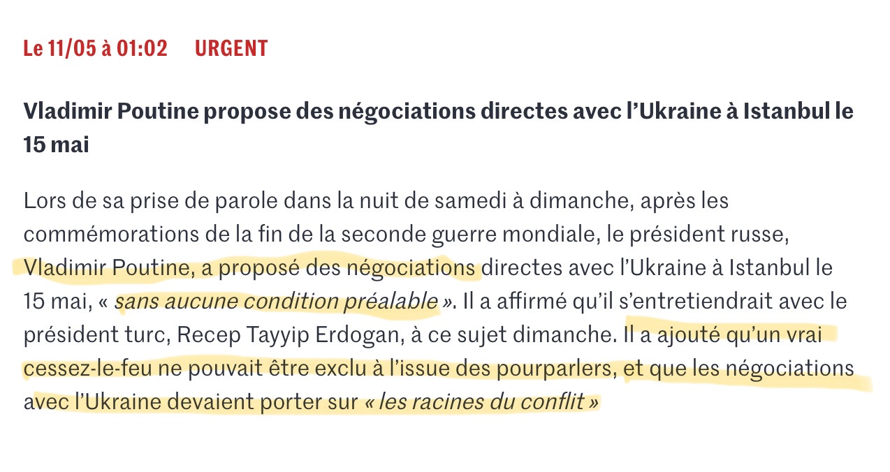 A ce stade, le 11 mai, Poutine refuse le cessez-le-feu en proposant des négociations « sans conditions préalables […] pour discuter des causes profondes de cette guerre », les « conditions préalables » étant justement cette trêve des armes. Poutine utilise cet argument depuis des années pour faire croire qu’il veut la paix tout en continuant la guerre. Il l’a déjà largement utilisé pour prolonger pendant des mois ses discussions avec l’équipe de Donald Trump. Et sur le terrain, plus d’une centaine de drones ont bombardé l’Ukraine ce dimanche matin.