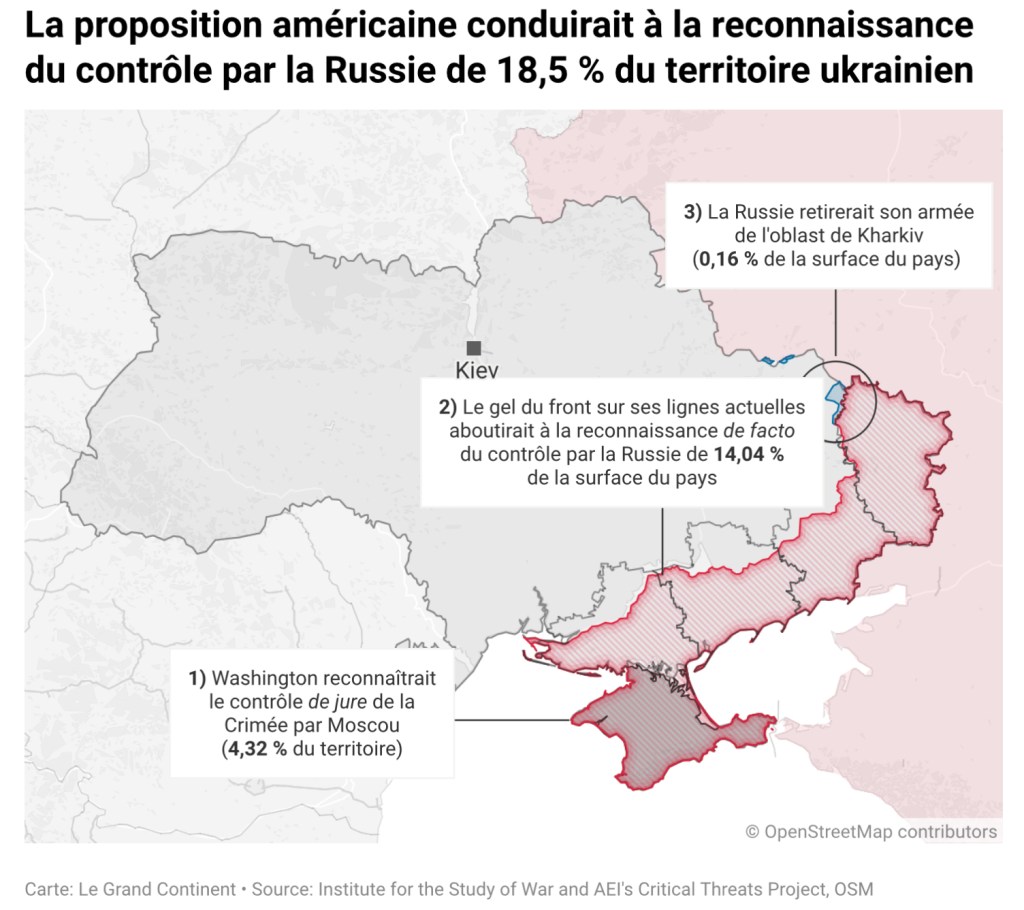 Dans ce plan, les concessions territoriales sont importantes : la péninsule de la Crimée est de fait attribuée à la Russie qui l’a annexée illégalement en 2014 et la plupart des territoires conquis par l’armée russe lui sont concédés. Ce plan devra s’appuyer sur un mécanisme intelligent de tracé d’une ligne de démarcation qui fasse sens, plutôt que de figer pour un temps indéterminé une ligne de front aussi biscornue que tourmentée.