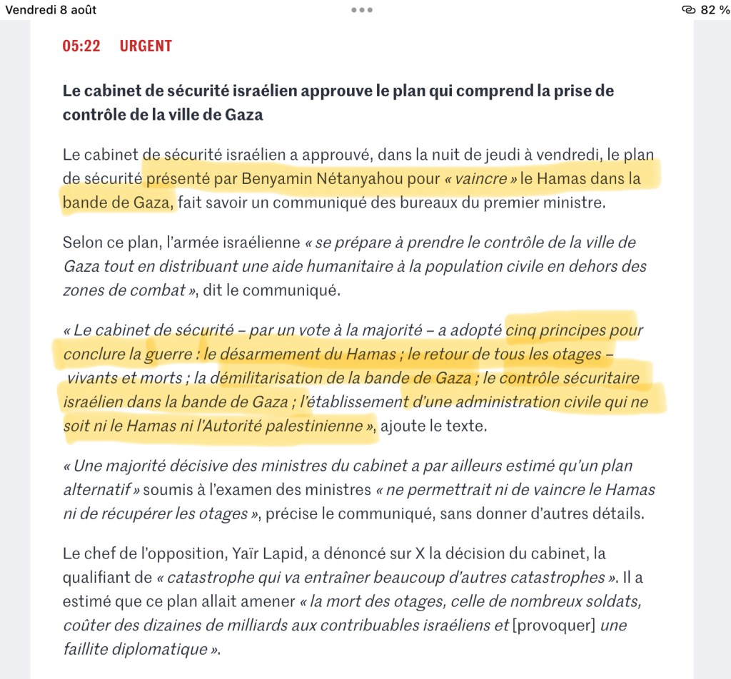 Quant aux otages israéliens – il ne reste plus qu’une vingtaine de survivants –, ce n’est pas en les bombardant plus encore (80% de Gaza est détruite) et en envahissant pour la troisième fois ce territoire palestinien qu’ils seront sauvés. Les 22 mois de guerre précédents l’ont solidement démontré, seuls des cessez-le-feu négociés ont permis jusqu’ici de sortir vivants des otages. Cela n’a pas échappé aux familles désespérées par les choix hypocrites de Netanyahou, qui prétend vouloir les sauver alors qu’il les sacrifie.