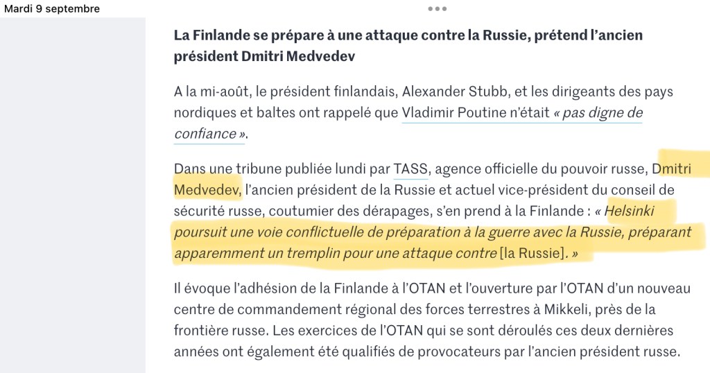 Notons enfin que la Russie ne dispose plus actuellement des moyens militaires nécessaires pour déclencher une guerre contre un autre pays, a fortiori contre un groupe de pays comme l’OTAN, mais elle se fait plus menaçante que jamais. Dmitri Medvedev, l’ancien président de la Russie et actuel vice-président du conseil de sécurité russe, vient ainsi de déclarer que la Finlande constituait une menace contre l’empire russe, la réthorique de Poutine pour justifier son « opération militaire spéciale » contre l’Ukraine…