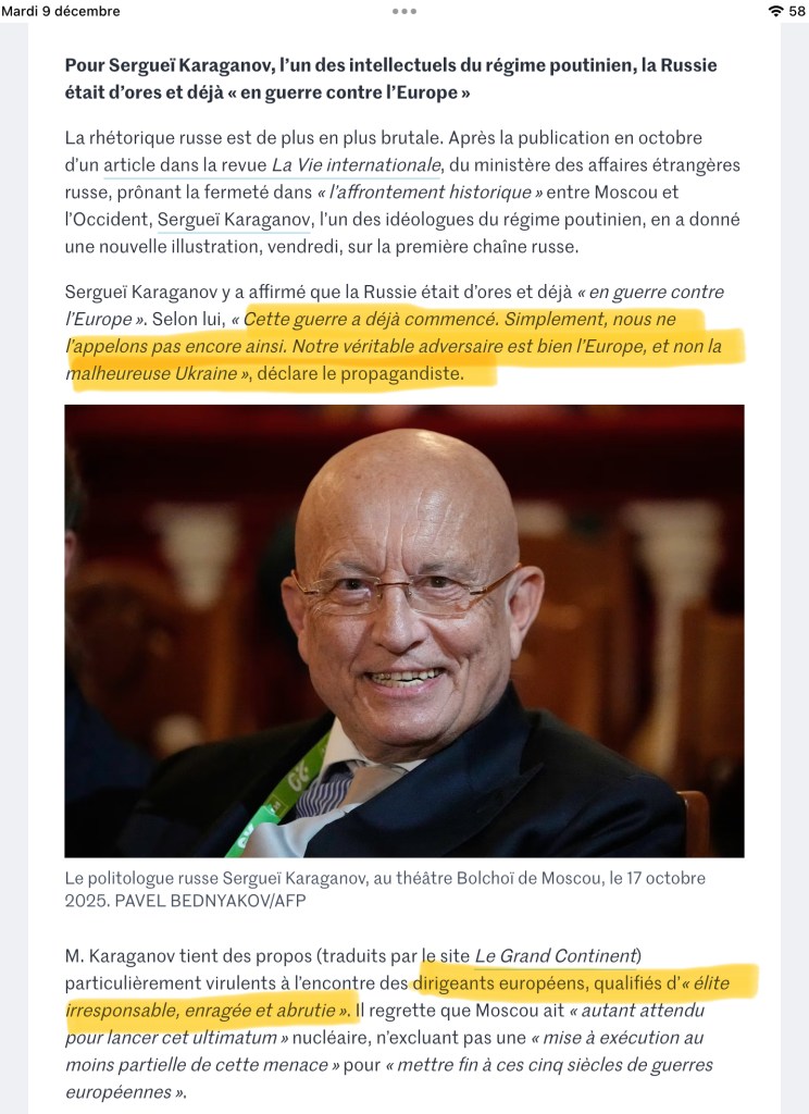je doute que Poutine cède. Par ailleurs face à l’action de Trump au large du Vénézuela, Poutine s’est empressé d’apporter son soutien à Maduro. Compte tenu de son appétit de deal, Trump ne risque t’il pas de lorgner davantage vers le pétrole vénézuelien en échange d’une liberté en Ukraine qu’il laisserait à Poutine en Ukraine ?