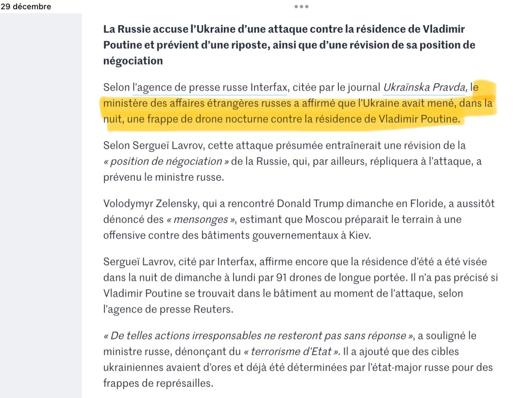 Le maître du Kremlin veut bloquer cette dynamique sans se voir reprocher son échec par le président américain, et il tente un énième mensonge, dont il est coutumier mais qui cette fois va prendre une dimension inattendue : Poutine téléphone le lundi 28 matin à Trump pour accuser Zelensky de… lui mentir en affirmant se rallier à son « projet de paix ». Il accuse en effet le président ukrainien d’avoir essayé dans le même temps d’attaquer une de ses résidences personnelles, dans cette nuit du 28 au 29, par un essaim de drones, 91 drones qui auraient visé sa propre maison, une provocation sans nom, une offense au projet de Trump.