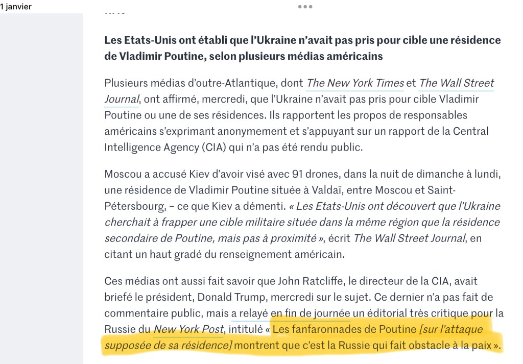 Autrement dit, cette « attaque » contre une des résidences de Poutine, en pleine négociation sur la « paix », n’est qu’un mensonge de plus du régime russe. Un mensonge dénoncé par tous les dirigeants européens qui ont partagé les renseignements américains avec leurs propres sources, un mensonge de trop qui met maintenant Donald Trump en porte à faux.