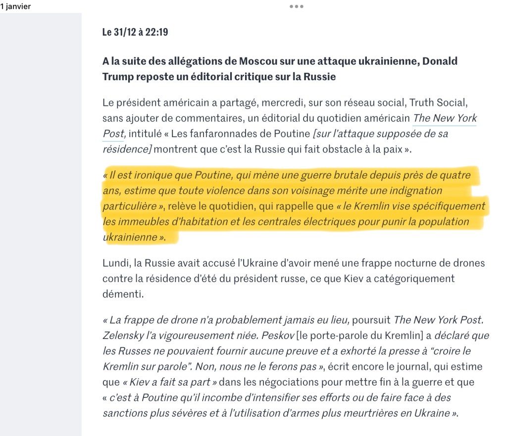 En souhaitant que cette année 2026 voit effectivement cette guerre russe contre l’Ukraine se terminer… et ne pas recommencer.