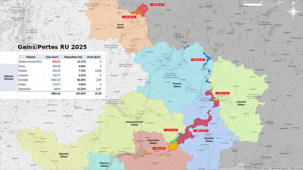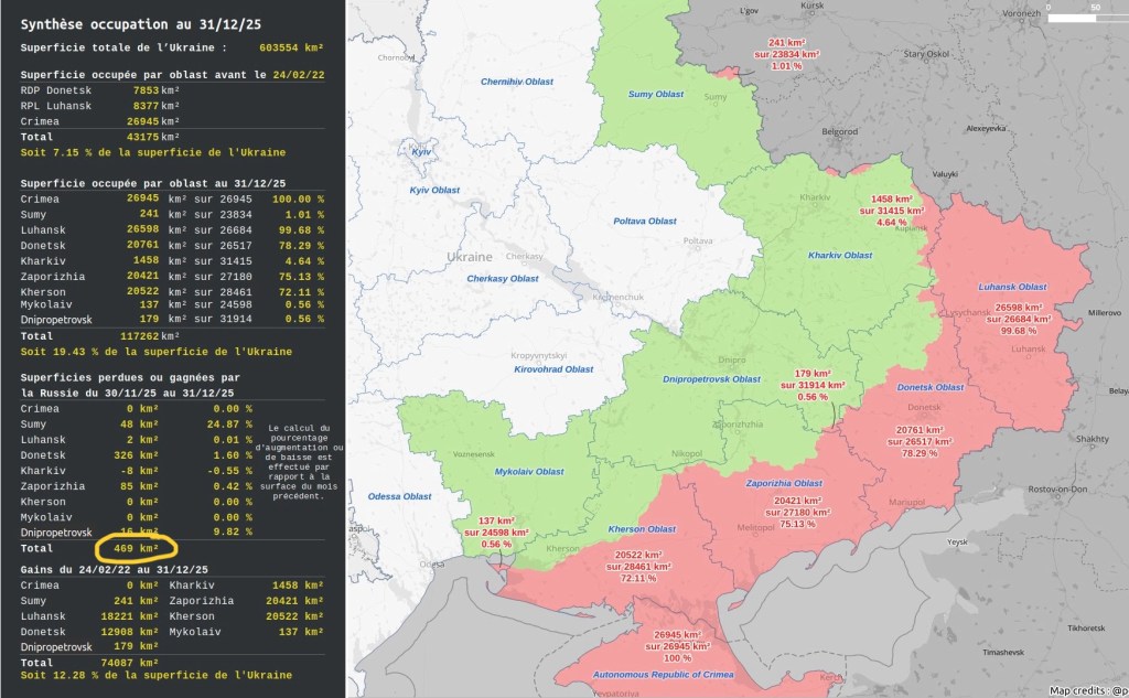 Sur le terrain en réalité, l’armée russe s’est emparée en décembre 2025 de moins de 500 km2, soit le millième de la surface de l’Ukraine libre. Pour l’année 2025, même en intégrant la reconquête de Koursk que Trump a imposée, l’armée russe a conquis moins de 5 000 km2. A cette vitesse, il faudrait un siècle à l’armée russe pour soumettre l’Ukraine.