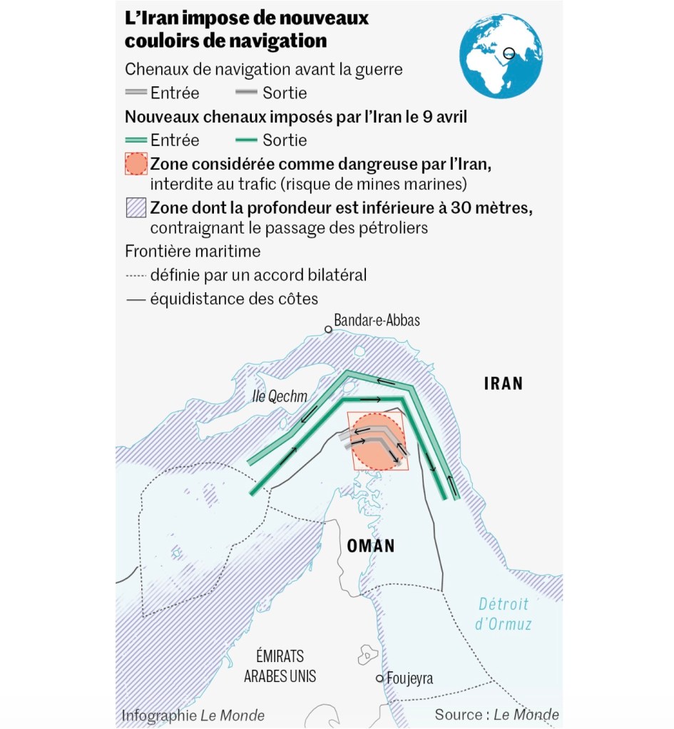 Le second mouvement commence avec le cessez-le-feu du 8 avril, le régime iranien organisant une circulation sous son contrôle du trafic maritime en décrétant que la partie sud du détroit n’est pas sûre, comprendre « qu’elle pourrait être minée ». Et qu’ainsi pour traverser le détroit de « manière sécurisée », il faut emprunter le couloir de navigation à proximité des côtes iraniennes et acquitter « au passage » un droit estimé entre un et deux millions $, soit de l’ordre du milliard $ de péages par semaine de circulation.
