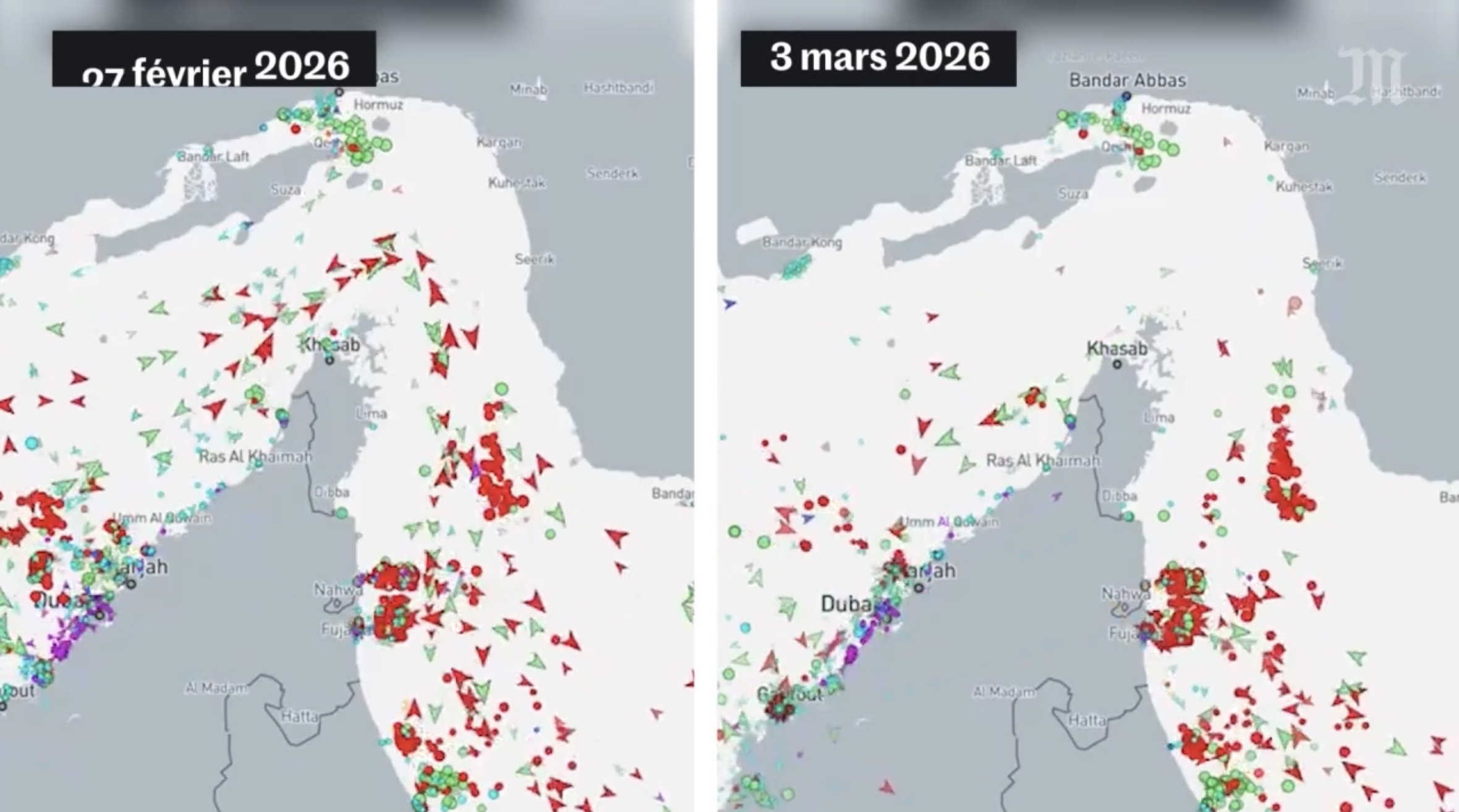 Le premier mouvement est évidemment sa fermeture de fait avec la guerre, puisque la circulation commerciale (110 navires par jour en temps « normal ») ne peut pas continuer en temps de guerre. L’utilisation de quelques drones par les Iraniens a suffi pour donner une image évidente des risques encourus, comme ces tankers qui ont brûlé pendant 48 heures aux portes de l’Irak, à l’autre bout du Golfe persique, à 1 100 km du détroit d’Ormuz. Autrement dit, dans le premier mouvement, ce n’est pas tant le détroit d’Ormuz qui est bloqué que l’intégralité du Golfe persique qui est fermé à la circulation maritime.